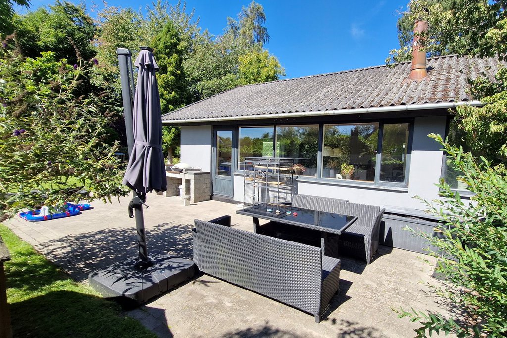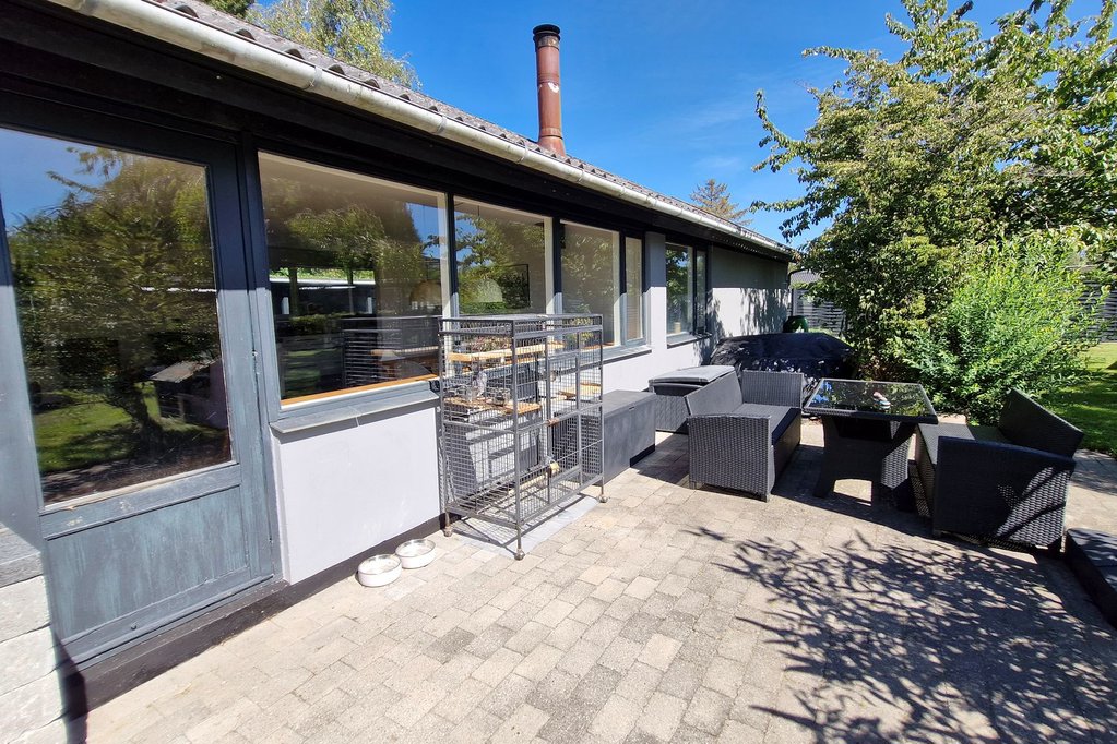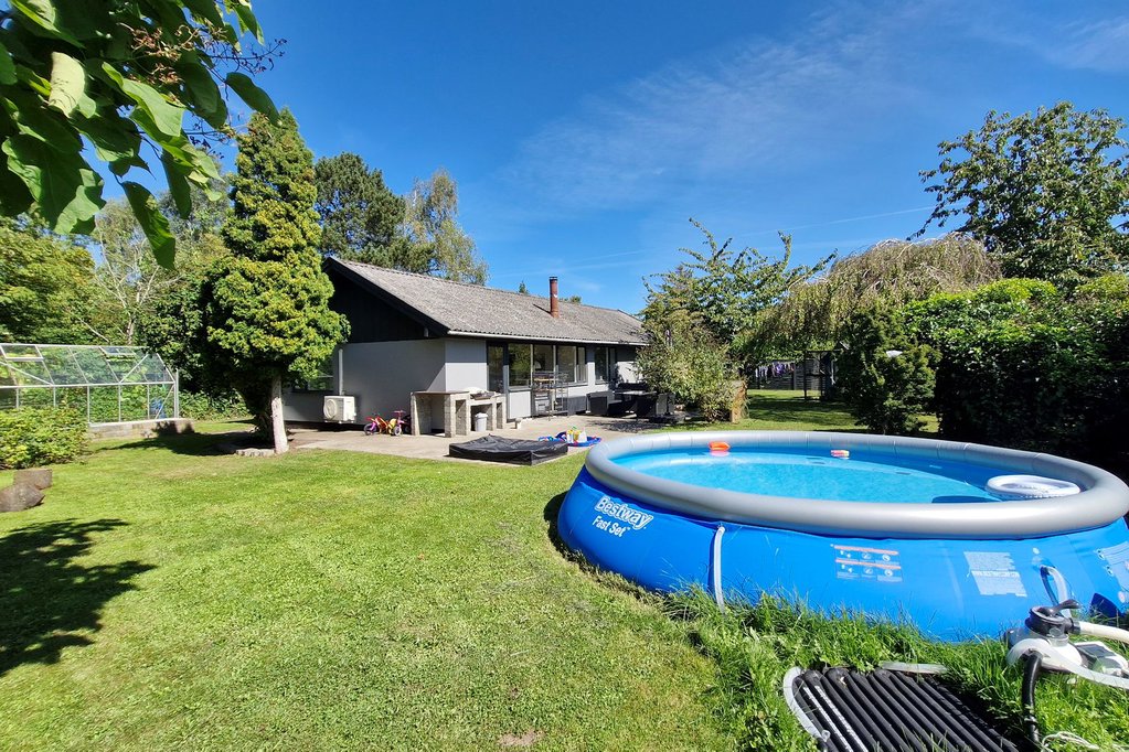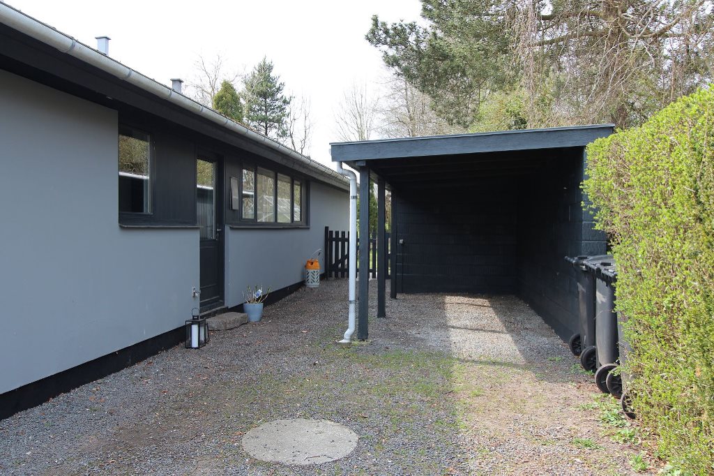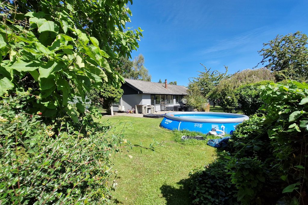 Haven henligger som solrig græsplæne med spredte beplantninger. Mod vest er der tættere beplantning, hvilket skaber flere hyggelige lækroge. Haven kan nydes fra stor sydvestvendt fliseterrasse med vildmarksbad. Ud mod den lille vej er der parkeringsareal og adgang til carport med indbygget udhus.