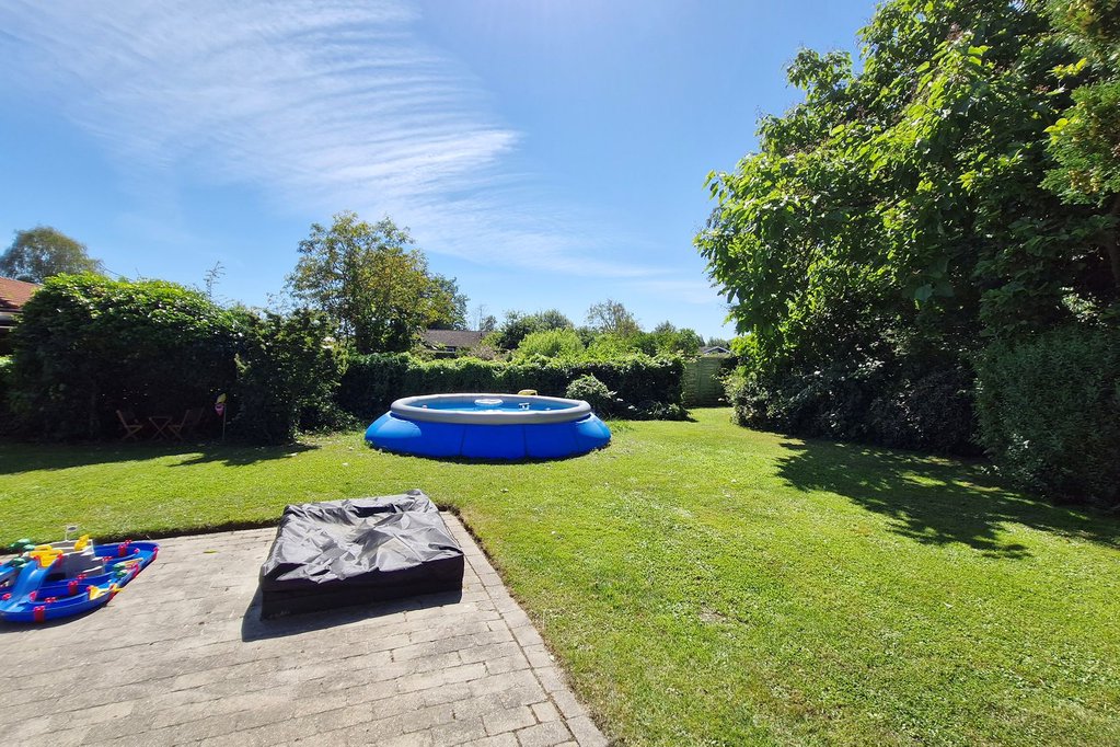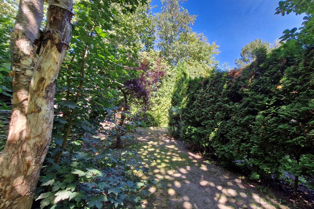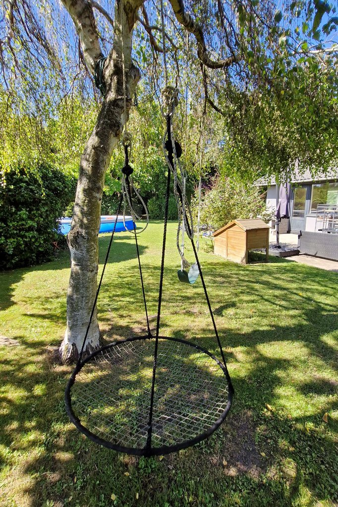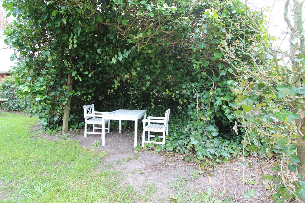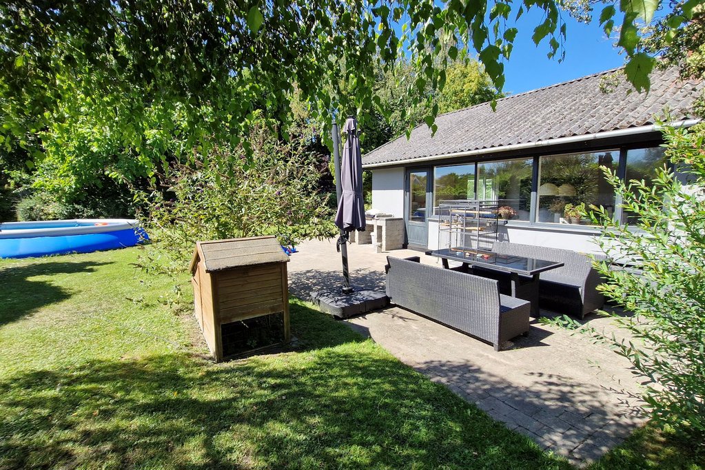 Haven henligger som solrig græsplæne med spredte beplantninger. Mod vest er der tættere beplantning, hvilket skaber flere hyggelige lækroge. Haven kan nydes fra stor sydvestvendt fliseterrasse med vildmarksbad. Ud mod den lille vej er der parkeringsareal og adgang til carport med indbygget udhus.