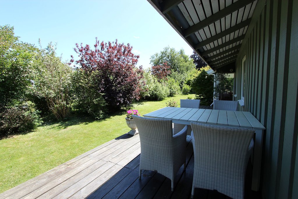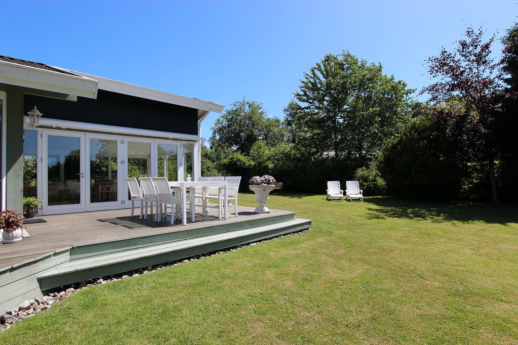 Huset ligger på en dejlig, nem grund med både solrig græsplæne og skøn, varieret beplantning. Huset er omgivet af et væld af terrasser bestående af østvendt morgenterrasse, højtliggende terrasse mod sydvest, afskærmet terrasse mod syd samt afskærmet terrasse mod nordvest. Ud mod den lille vej er der carport med indbygget udhus.