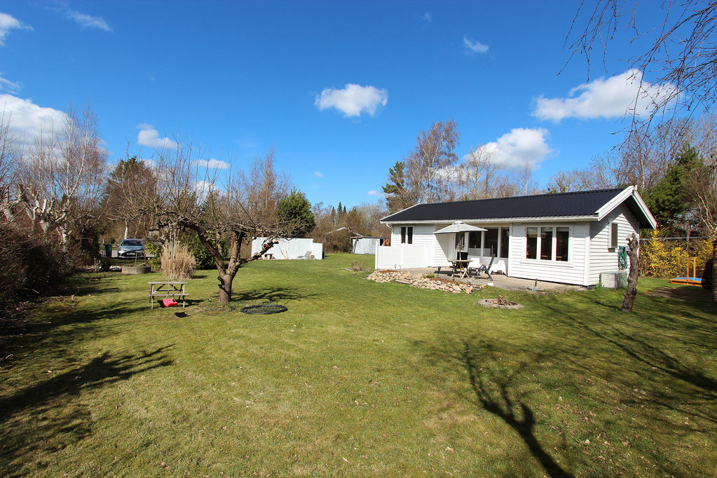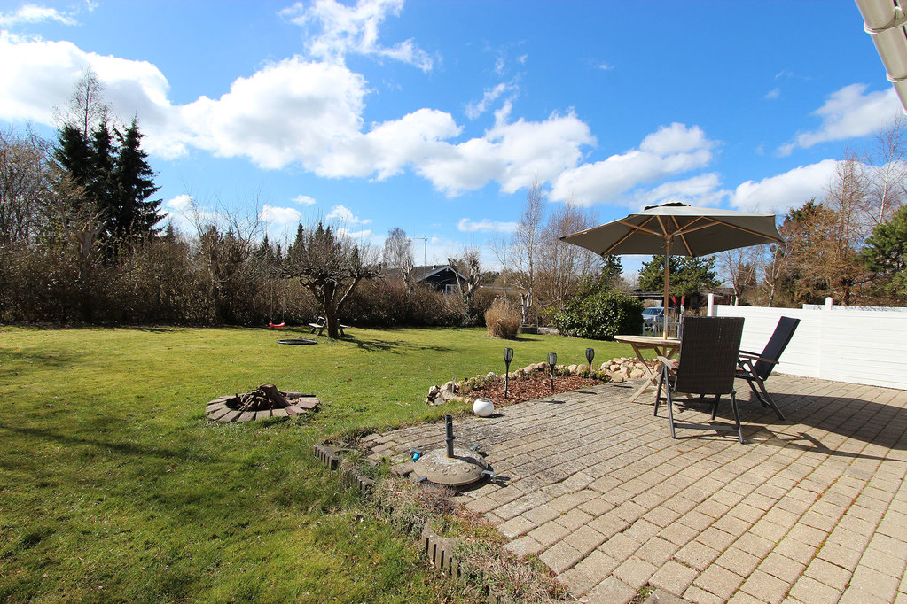 Huset er beliggende på en skøn, solrig grund, hvor nem græsplæne brydes af varierede beplantninger. Mod naboer og vej afskærmer god, tæt randbeplantning, hvilket skaber et dejligt, ugenert miljø i haven.