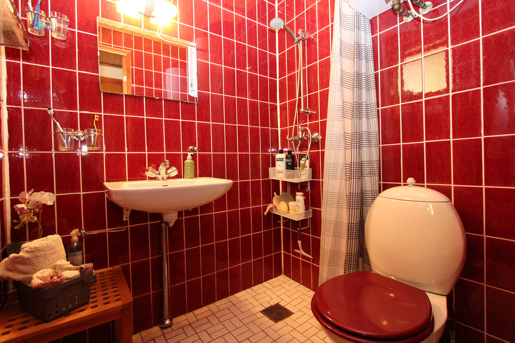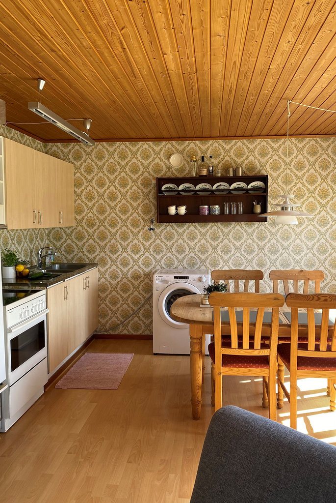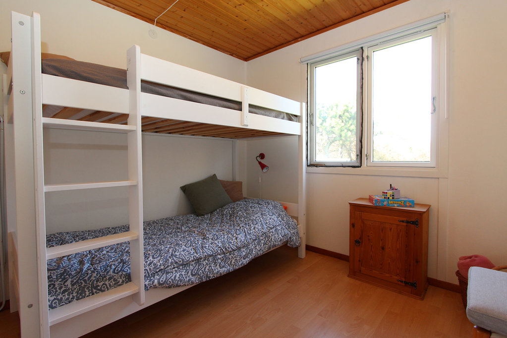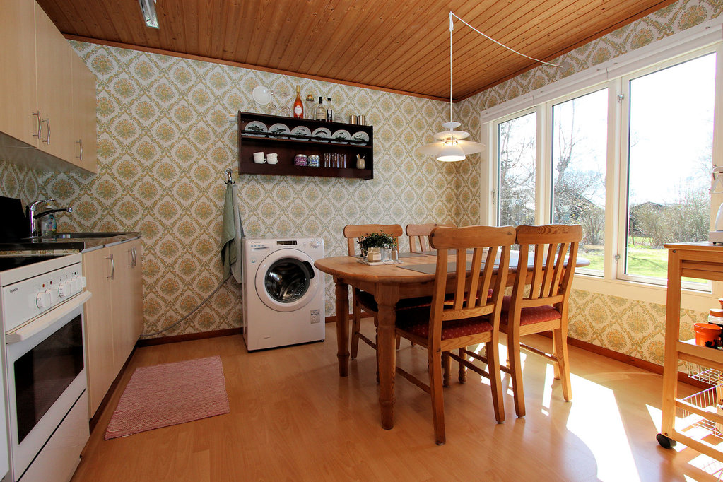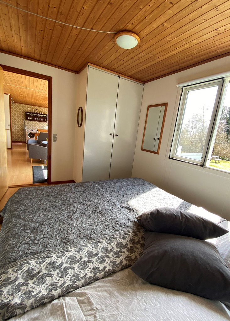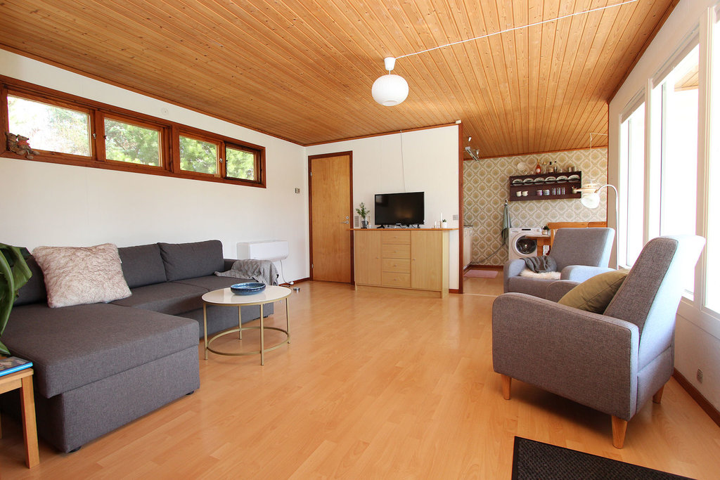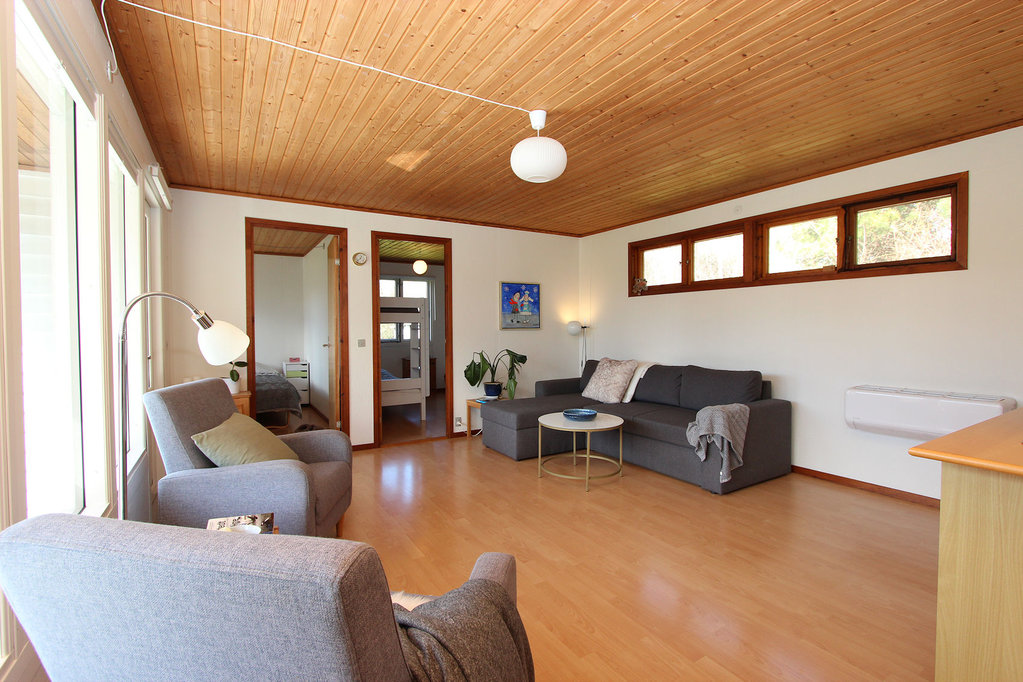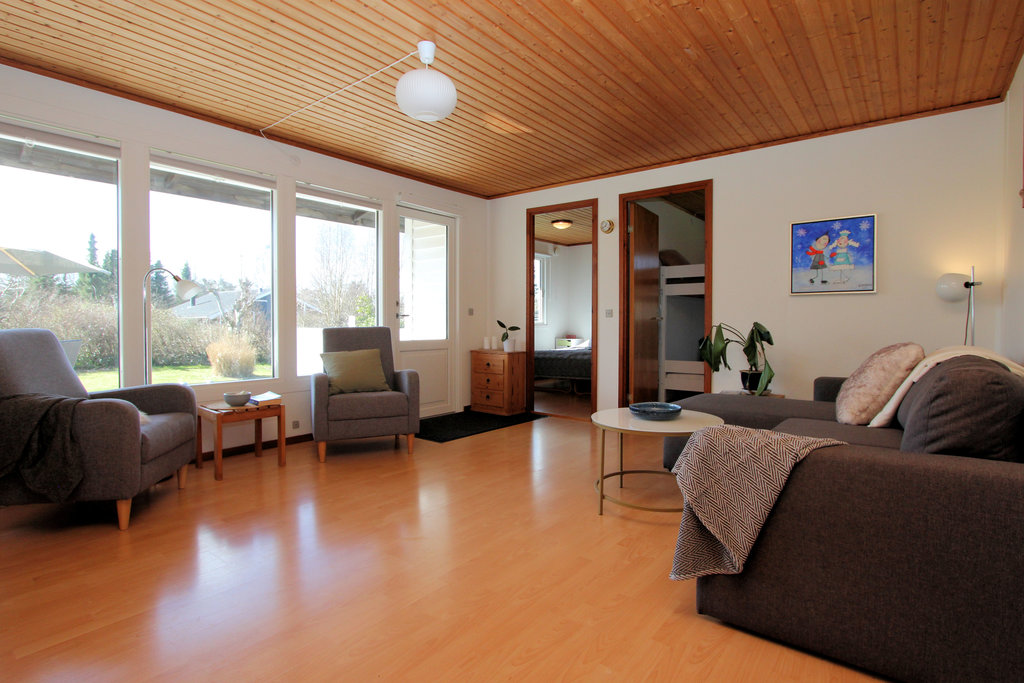 Lys opholdsstue med varmepumpe, store, sydvendte vinduespartier samt udgang til husets terrasse. Åbent køkken med spiseafdeling og store vinduespartier mod syd. To gode soveværelser med skabe. Flisebadeværelse med bruseniche. Lille entre med garderobeplads.