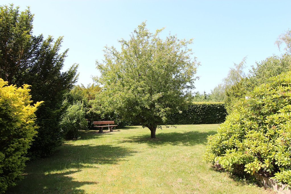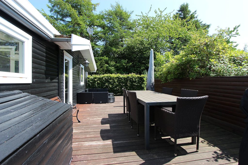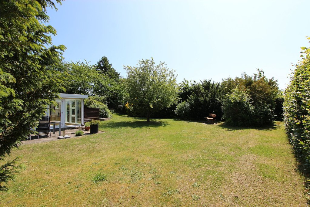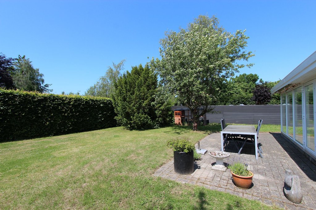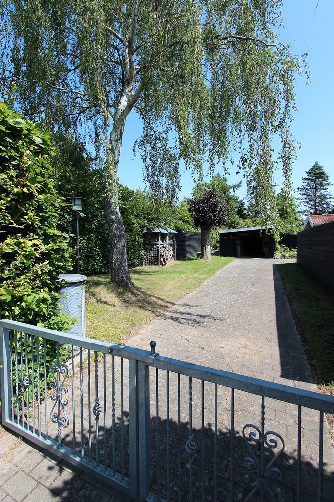 Ejendommen ligger på en dejlig grund med godt solindfald og flere terrasser. Grunden er yderst velafskærmet mod naboer og vej, hvilket skaber et helt ugenert miljø i haven. I haven er der både solrig græsplæne og varierede beplantninger, hvilket skaber hyggelige lækroge og skyggefulde pletter. Mod syd er der afskærmet træterrasse, mod vest stor fliseterrasse og nord for huset endnu en afskærmet fliseterrasse. I haven er der desuden udhus/anneks med egen terrasse samt flisebelagt indkørsel ledende til carport med indbygget udhus.