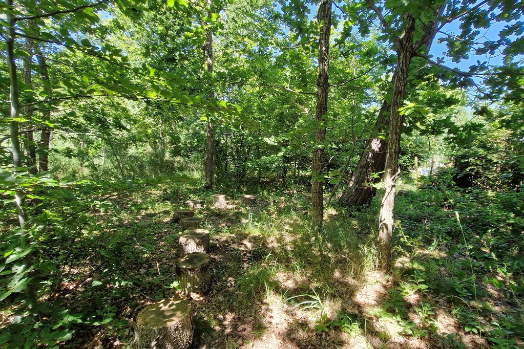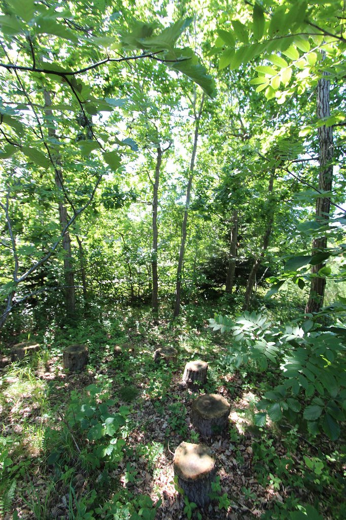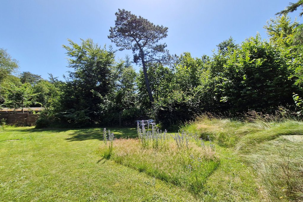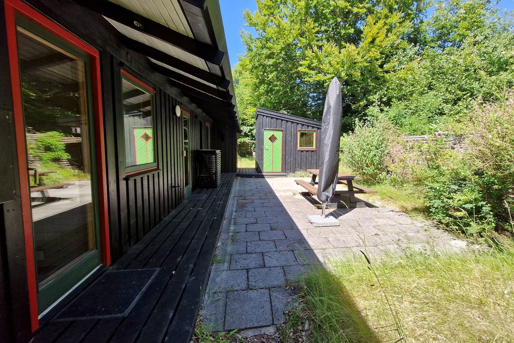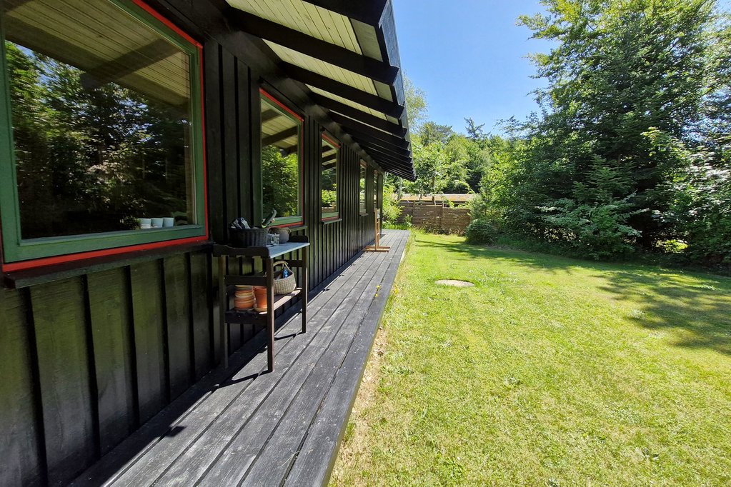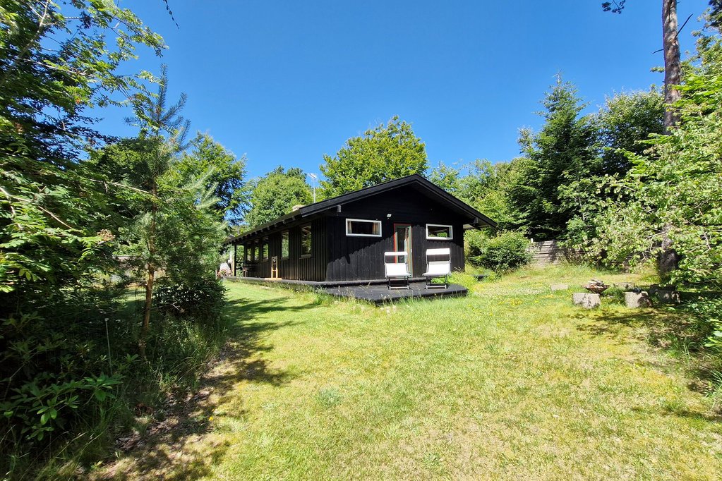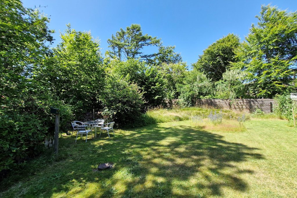 Grunden henligger som ren natur/skovgrund med et væld af skønne beplantninger. Omkring huset er der solrig græsplæne, der skaber lys og luft på terrasserne, men ellers præges grunden af vildtvoksende træer og buske. Ved huset er der flere terrasser bestående af sydvendt træterrasse, overdækket træterrasse mod vest samt fliseterrasse mod øst. I forbindelse med ejendommen er der lille, indbygget udhus samt fritliggende udhusbygning.