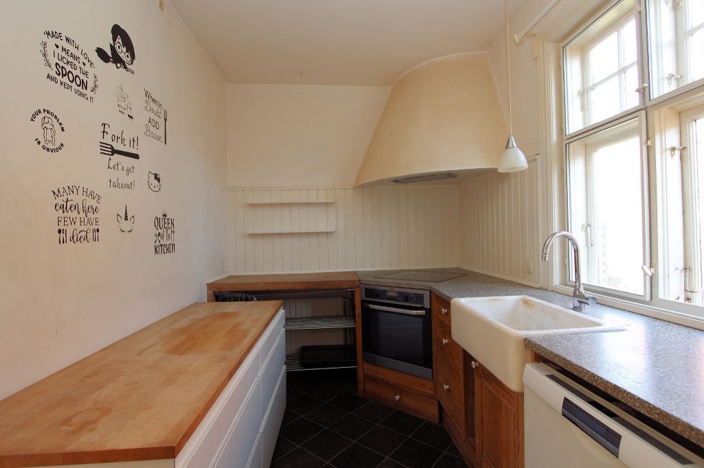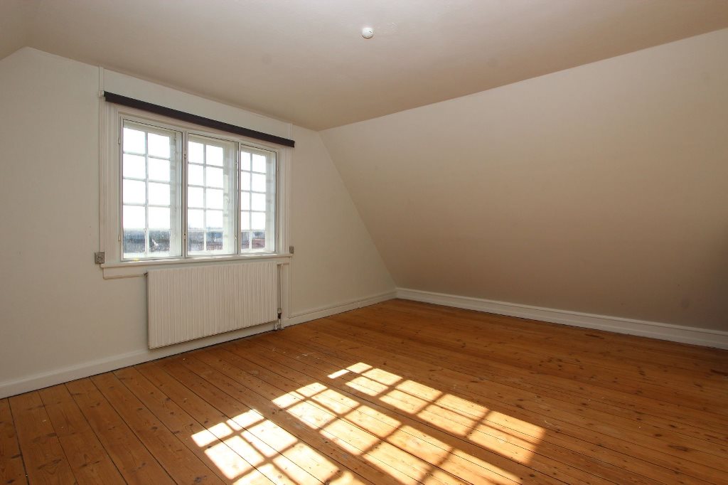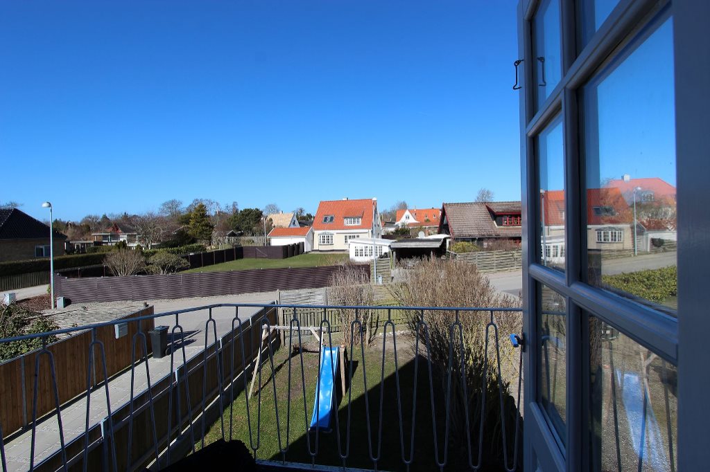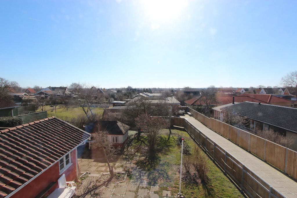 To lyse stuer ensuite. Køkken med udgang til sydvendt fliseterrasse. Flisebadeværelse med bruseniche. Entre med trappe til 1. salen. På 1. salen er der to rummelige soveværelser, det ene med udgang til nordvendt balkon, det andet med en skøn udsigt over byen mod syd.